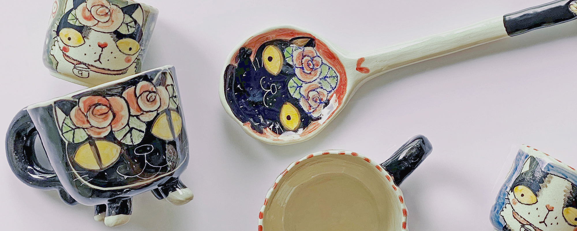 Discover our artisanal pottery lineup of hand-painted ceramic tableware with whimsical cat...